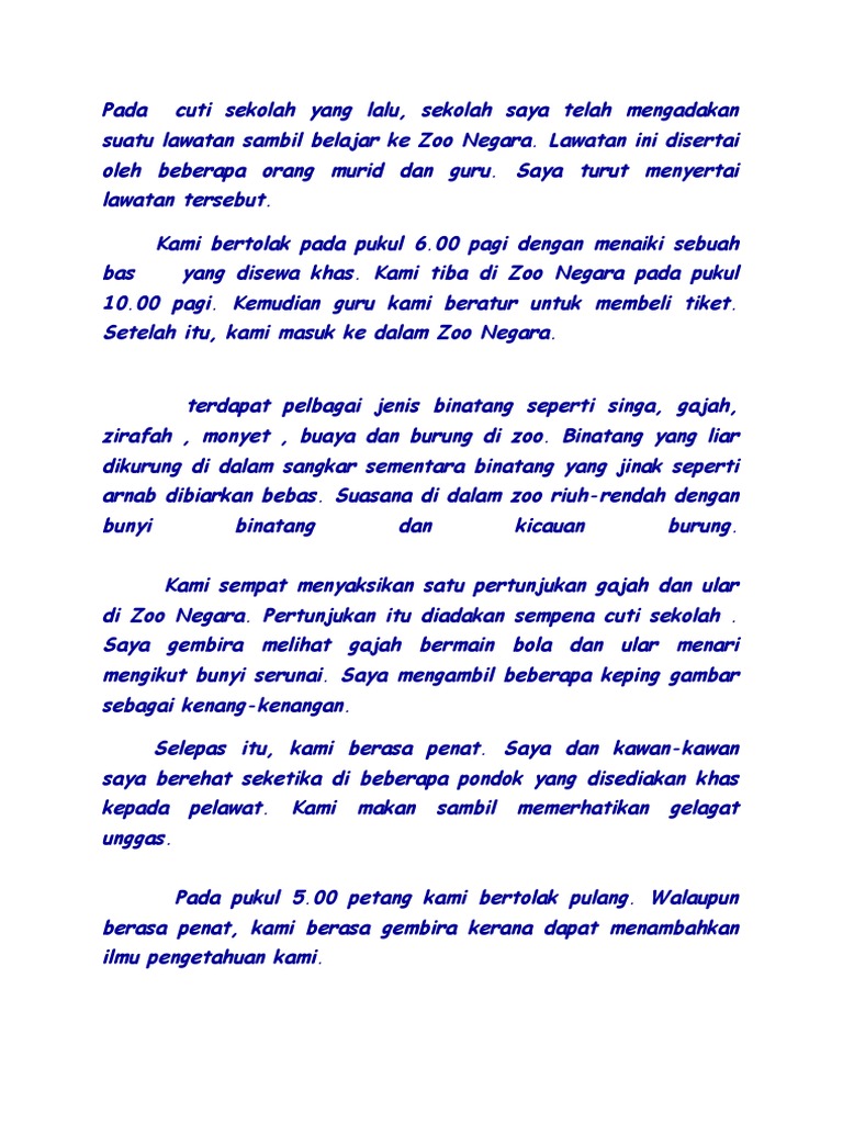Kami bertolak ke sana pada pukul 900 pagi dengan menaiki kereta bapa. Pada cuti _____ yang lalu bapa membawa kami. Contoh karangan upsr melawat ke zoo negara.